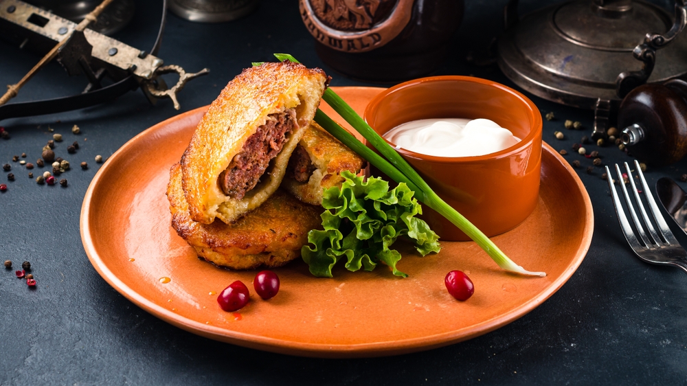 Очистите 6 крупных картофелин, натрите на мелкой терке и отожмите лишний сок через марлю. Добавьте 1 яйцо, 2 ст. л. муки, соль и перец — тесто должно быть плотным. Для начинки обжарьте 300 г фарша (свино-говяжьего) с мелко нарезанной луковицей до румяности. На смоченную ладонь выложите картофельную массу, сформируйте лепешку, в центр положите 1 ч. л. начинки и аккуратно защипните края, придавая овальную форму.