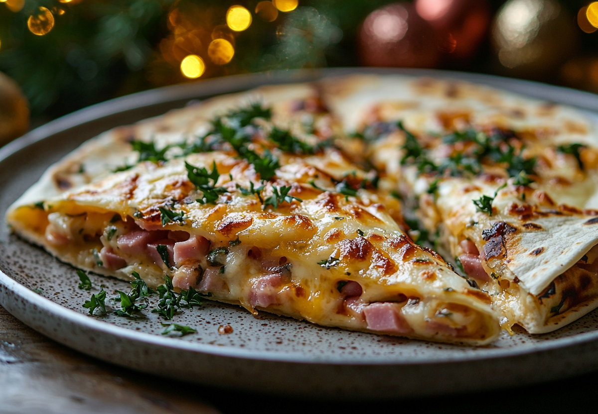 Вкус потрясающий: хрустящая, ароматная лепешка, сочная начинка с солоноватой ветчиной, нежным помидором и тягучим расплавленным сыром.