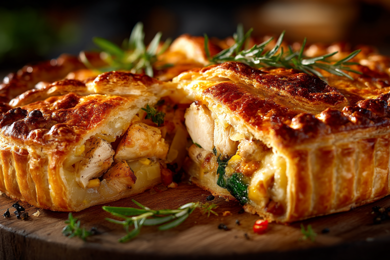 Контраст хрустящего, почти слоеного теста и нежной, сочной начинки — главная фишка этого пирога. А золотистая сырная корочка добавляет пикантности и завершает образ идеальной выпечки.