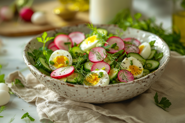 Яйца лучше отварить заранее, но если времени нет — сделайте это параллельно с нарезкой овощей, затем остудите в холодной воде. Редис и огурцы нарежьте тонкими полукружьями — так салат будет выглядеть аккуратно и аппетитно. Яйца порежьте крупно, зелень и чеснок мелко измельчите.