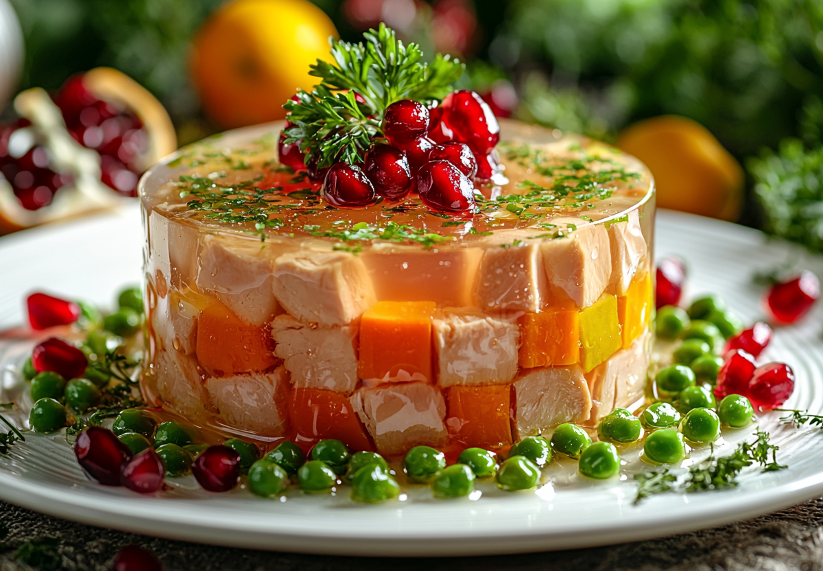 И не надо тысячу лет варить холодцы: заливное «Новогодняя ночь» вкуснее — простой рецепт с курицей сразит всех. Это настоящая находка для праздничного стола! Прозрачный бульон, нежное куриное мясо и яркие овощные акценты превращают обычную закуску в съедобную картину, которой невозможно не восхищаться. И главное — готовится оно гораздо быстрее, чем классический холодец, а эффект потрясающий: гости удивятся и попросят добавки.