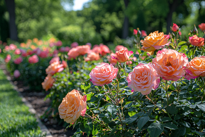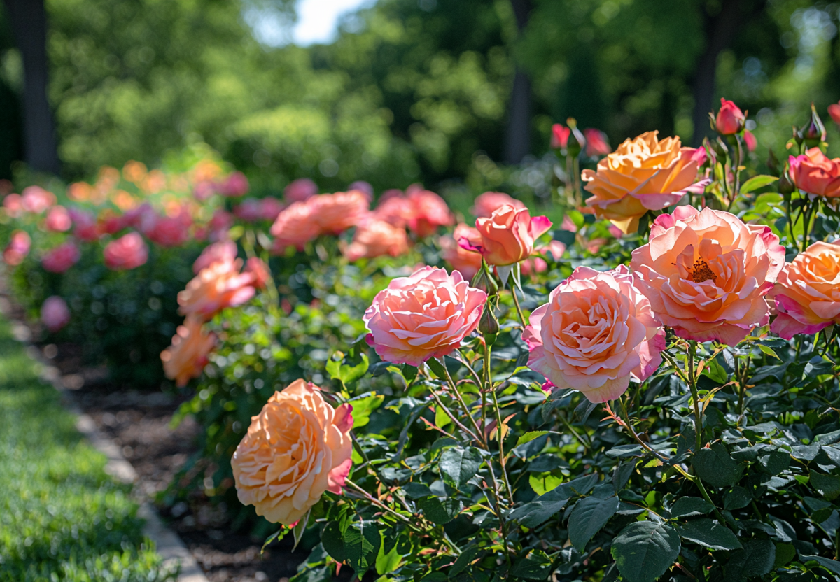 Другой безупречный кандидат — легендарная чайно-гибридная роза Gloria Dei с крупными (до 15 см) бутонами благородной желто-розовой окраски. Она обладает сильным ароматом и цветет до октября, хотя и требует более тщательного укрытия на зиму.