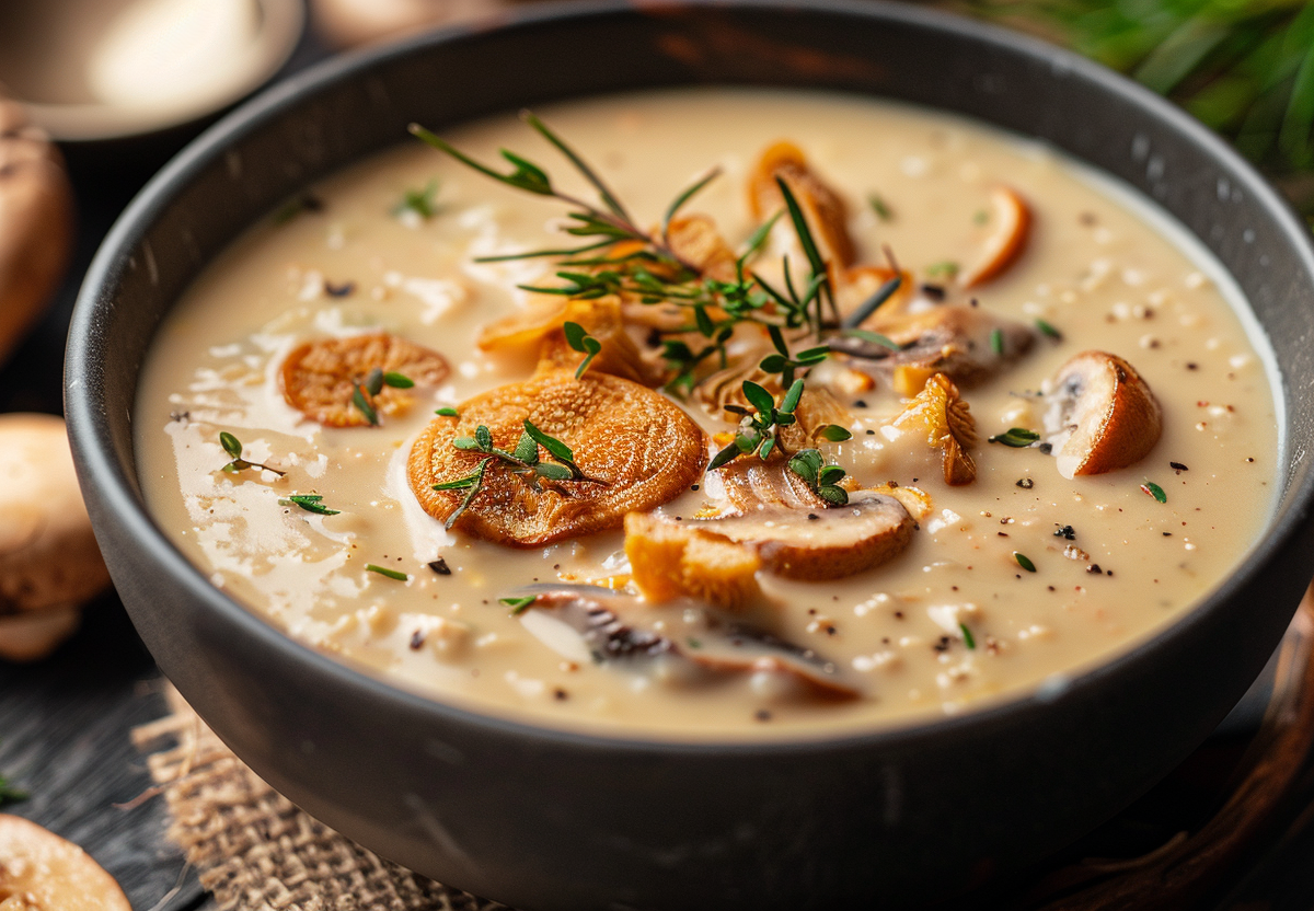 Нагрейте 40 мл сливочного и 1 ст. л. оливкового масла в кастрюле. Обжарьте мелко нарезанную луковицу-шалот до прозрачности. Добавьте 400 г свежих лисичек, жарьте 7–8 минут, пока грибы не отдадут сок. Влейте 50 мл сухого белого вина, выпарите почти полностью. Всыпьте столовую ложку муки, перемешайте и готовьте 1 минуту. Постепенно влейте 700 мл горячего куриного бульона, непрерывно помешивая. Добавьте веточку свежего тимьяна и лавровый лист. Дайте супу закипеть, затем убавьте огонь и варите 15 минут под крышкой. Удалите тимьян и лавр. Взбейте суп погружным блендером до однородности. Верните в емкость, в которой вы готовили суп, влейте 100 мл жирных сливок или кокосового молока для веган-версии. Прогрейте, не доводя до кипения. Приправьте морской солью и свежемолотым белым перцем по вкусу. Для пикантности добавьте щепотку тертого мускатного ореха и 1 ч. л. лимонного сока. Подавайте горячим, украсив обжаренными целыми шляпками лисичек, веточкой эстрагона и тертым козьим сыром (опционально).
