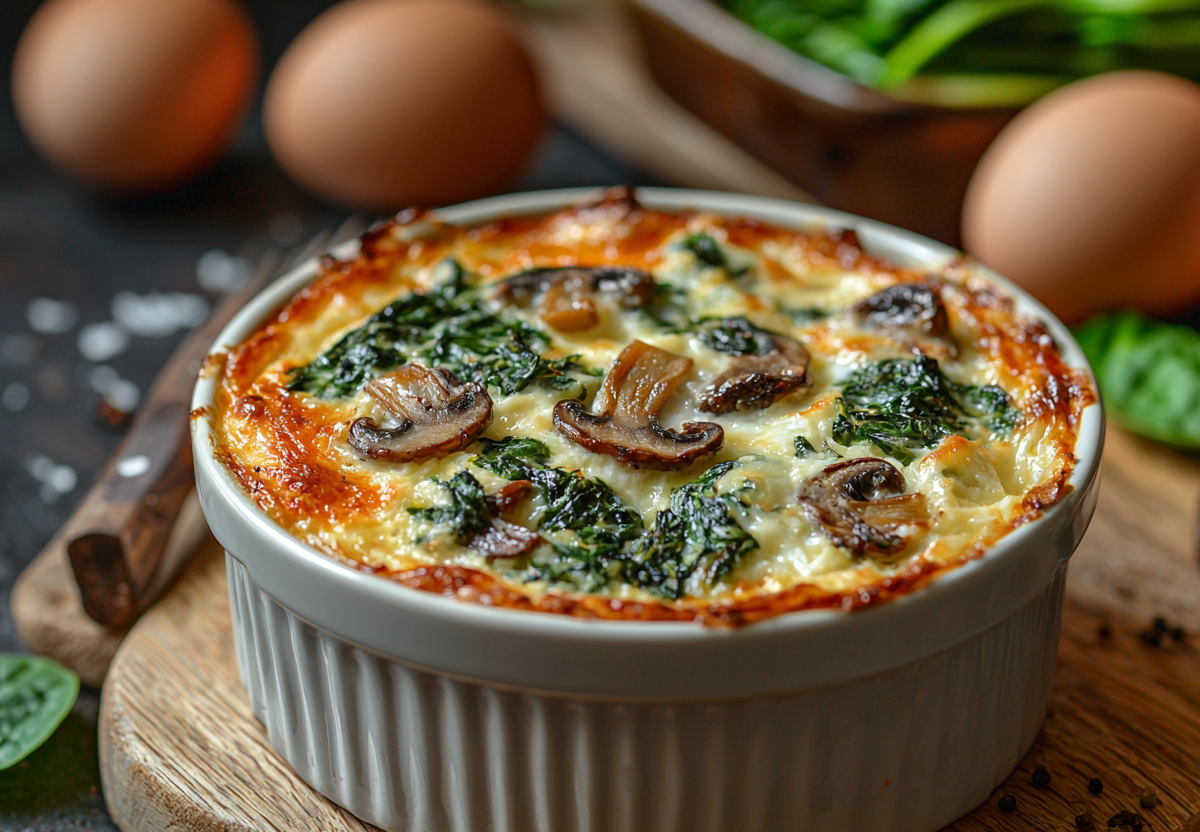 Яично-творожное суфле с грибами и шпинатом — это нежное, воздушное и невероятно полезное блюдо, которое идеально подойдет для завтрака или легкого ужина. Сочетание творога, яиц, ароматных грибов и свежего шпината создает гармоничный вкус, а воздушная текстура суфле тает во рту. Это блюдо готовится быстро и станет отличным вариантом для тех, кто следит за питанием, но не хочет отказываться от вкусной еды.