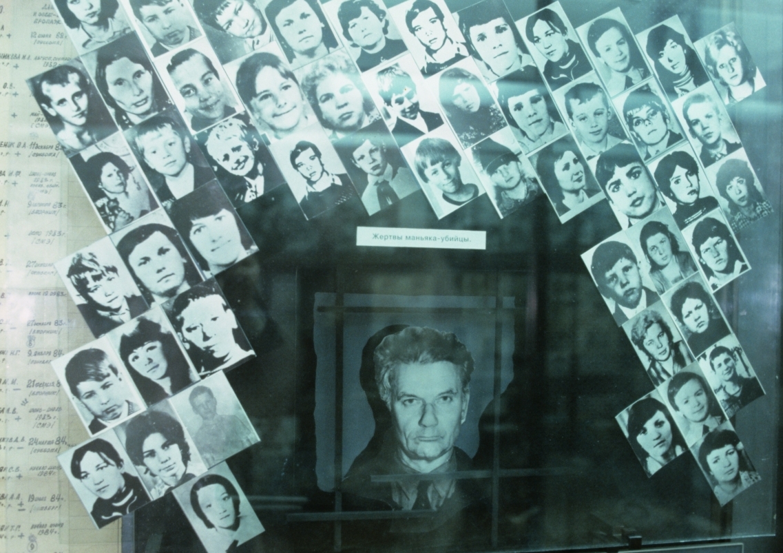 Центральный музей МВД РФ. Серийный убийца, маньяк Андрей Чикатило, убивший с особой жестокостью 53 человека. Рядом с его фотографией размещены фотоснимки его жертв Центральный музей МВД РФ. Серийный убийца, маньяк Андрей Чикатило, убивший с особой жестокостью 53 человека. Рядом с его фотографией размещены фотоснимки его жертв Фото: Александр Лыскин/РИА Новости