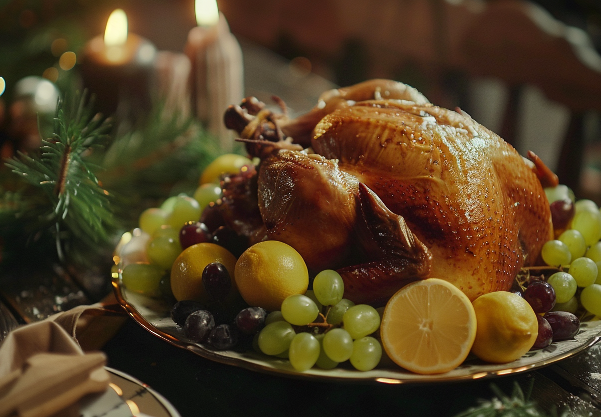 Запеченная индейка для новогоднего стола — это идеальное блюдо для праздничного настроения. Добавление нежного винограда и ароматного маринада из оливкового масла делает это блюдо особенным, подчеркивая естественную сочность индейки и добавляя изысканную сладость.