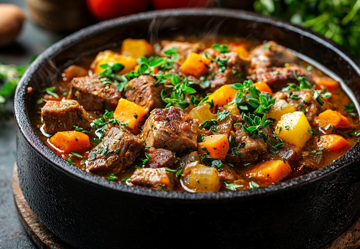 Готовлю я так: 500 граммов баранины (лопатка или грудинка) нарезаю крупными кубиками и обжариваю в глубоком казане до румяной корочки. Добавляю одну нарезанную кубиками луковицу и две измельченные морковки, пассерую до мягкости. Заливаю все 500 миллилитрами темного пива и таким же количеством говяжьего бульона. Добавляю веточку свежего тимьяна, лавровый лист и тушу под крышкой на медленном огне около полутора часов. Затем кладу две нарезанные кубиками картофелины и продолжаю готовить еще 30–40 минут до мягкости мяса и овощей. В конце заправляю рубленой петрушкой и подаю с темным хлебом — просто, но невероятно вкусно!