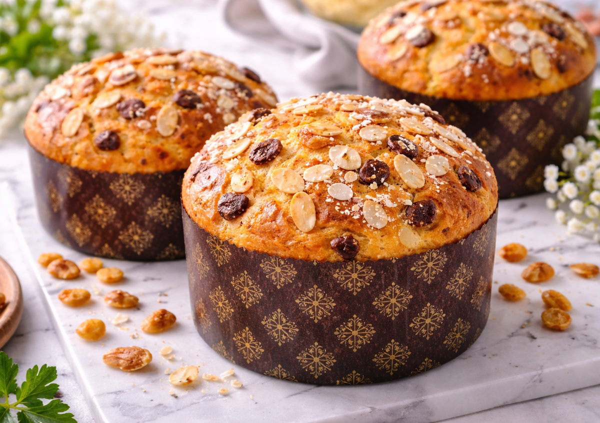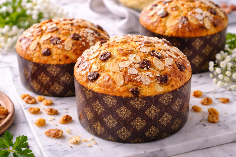 Перед выпечкой поверхность смазывают смесью молока и желтка. Выпекают при 180–190°C около 35–40 минут. Готовые панеттоне остужают и посыпают миндальными хлопьями.