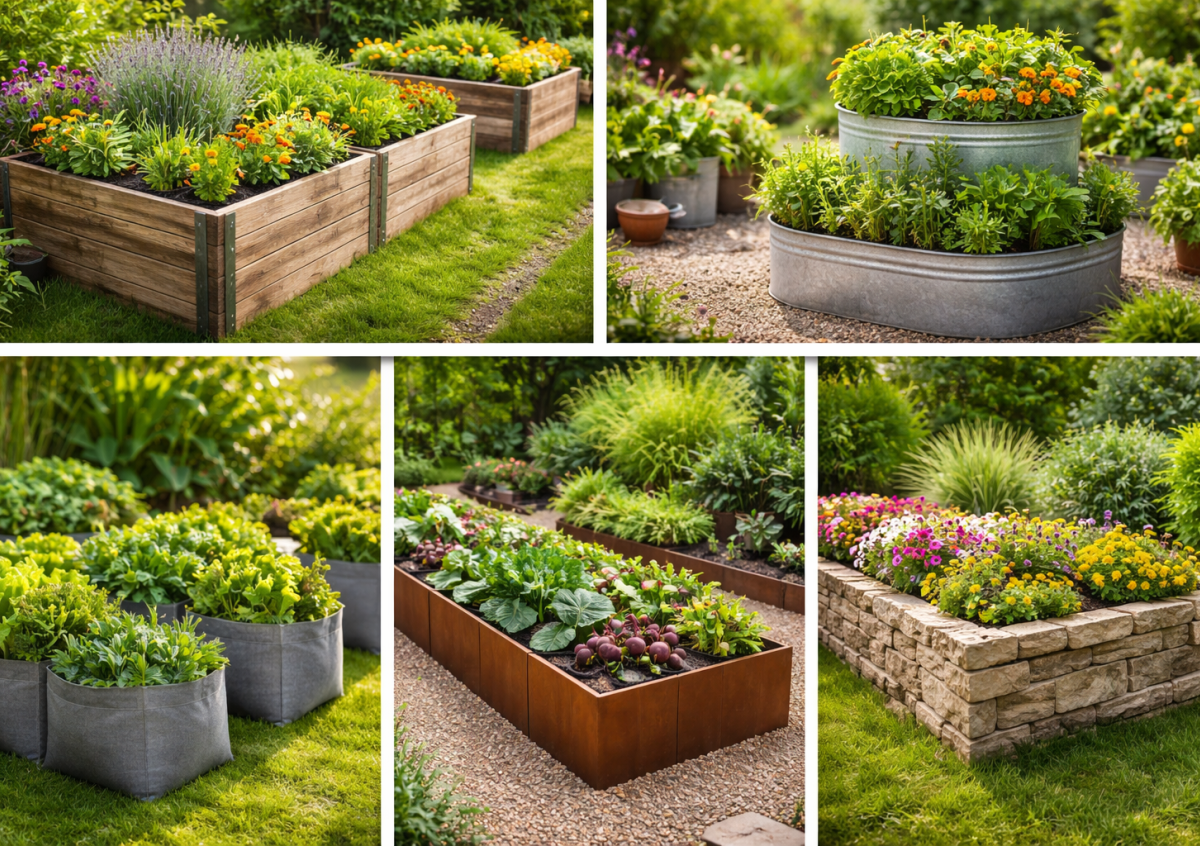 Современный тренд — текстильные клумбы. Это плотные геотекстильные мешки или контейнеры, которые хорошо пропускают воздух и влагу. Они лёгкие, мобильные и подходят даже для небольших участков или террас. Особенно удобны для сезонных посадок.