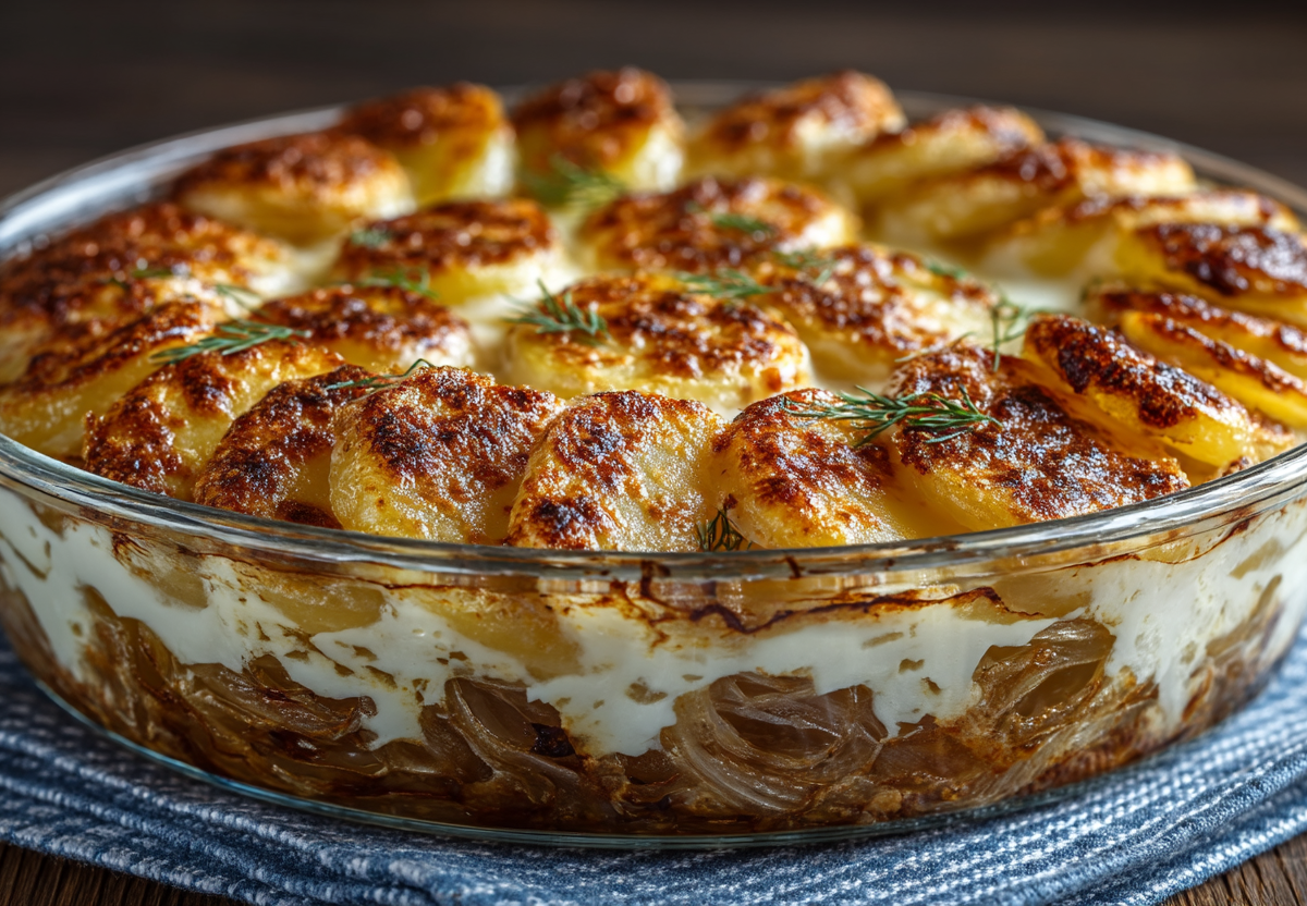 Для приготовления понадобится: 1 кг картофеля, 2 крупные луковицы, 200 г твердого сыра, 100–150 мл молока, 2-3 ст. л. растительного масла, соль, черный перец, паприка. Лук нарежьте тонкими полукольцами. На сковороде разогрейте 1 ст. л. масла и обжаривайте лук на среднем огне 10–15 минут, помешивая, до мягкости и легкой карамелизации. Разогрейте духовку до 180–190 °C. Переложите обжаренный лук в форму для запекания, равномерно распределив его по дну. Картофель нарежьте тонкими слайсами. Выложите картофель поверх лука. Посолите, поперчите, посыпьте специями. Сыр натрите на крупной терке и щедро посыпьте им картофель. Влейте молоко — оно должно доходить примерно до середины слоя картошки, не покрывая ее полностью. Накройте форму фольгой и запекайте 40 минут. Затем снимите фольгу и запекайте еще 15–20 минут.