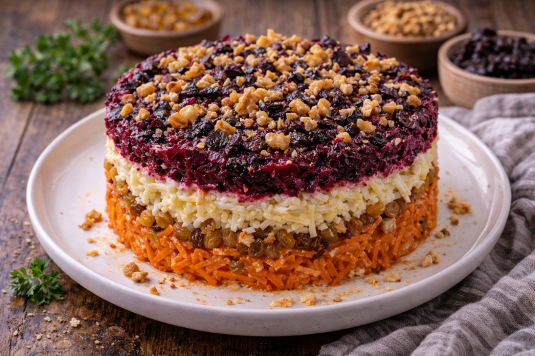 Этот салат всегда производит эффект «вау» — сначала из-за сочетаний, потом из-за вкуса. Сладость сухофруктов, пикантный чеснок и насыщенная свёкла создают яркий контраст, который цепляет с первой вилки. Получается сочный, многослойный салат с богатым вкусом и праздничным видом. Готовится из простых продуктов, а на столе ведёт себя как настоящий хит — исчезает первым.