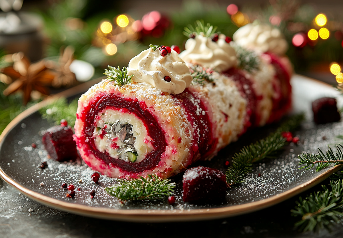 Рецепт: для коржа вам понадобится: 2–3 средние отварные свеклы (натереть на мелкой терке), 2 яйца, 3 ст. л. муки, соль, перец. Смешайте все ингредиенты для коржа, выложите массу на противень, застеленный пергаментом, разровняйте в тонкий прямоугольный пласт и запеките в разогретой до 180 °C духовке 15–20 минут. Готовому теплому коржу дайте немного остыть. Для начинки смешайте 200 г творожного сыра с 2 ст. л. майонеза. Равномерно распределите эту смесь по всей поверхности коржа. Сверху тонким слоем выложите мелко нарезанные маринованные огурцы (2–3 шт.) и 200 г филе слабосоленой селедки (мелкий кубик). Аккуратно, при помощи пергамента, сверните корж в плотный рулет. Заверните его в пищевую пленку и уберите в холодильник на 2–3 часа для пропитки и уплотнения.