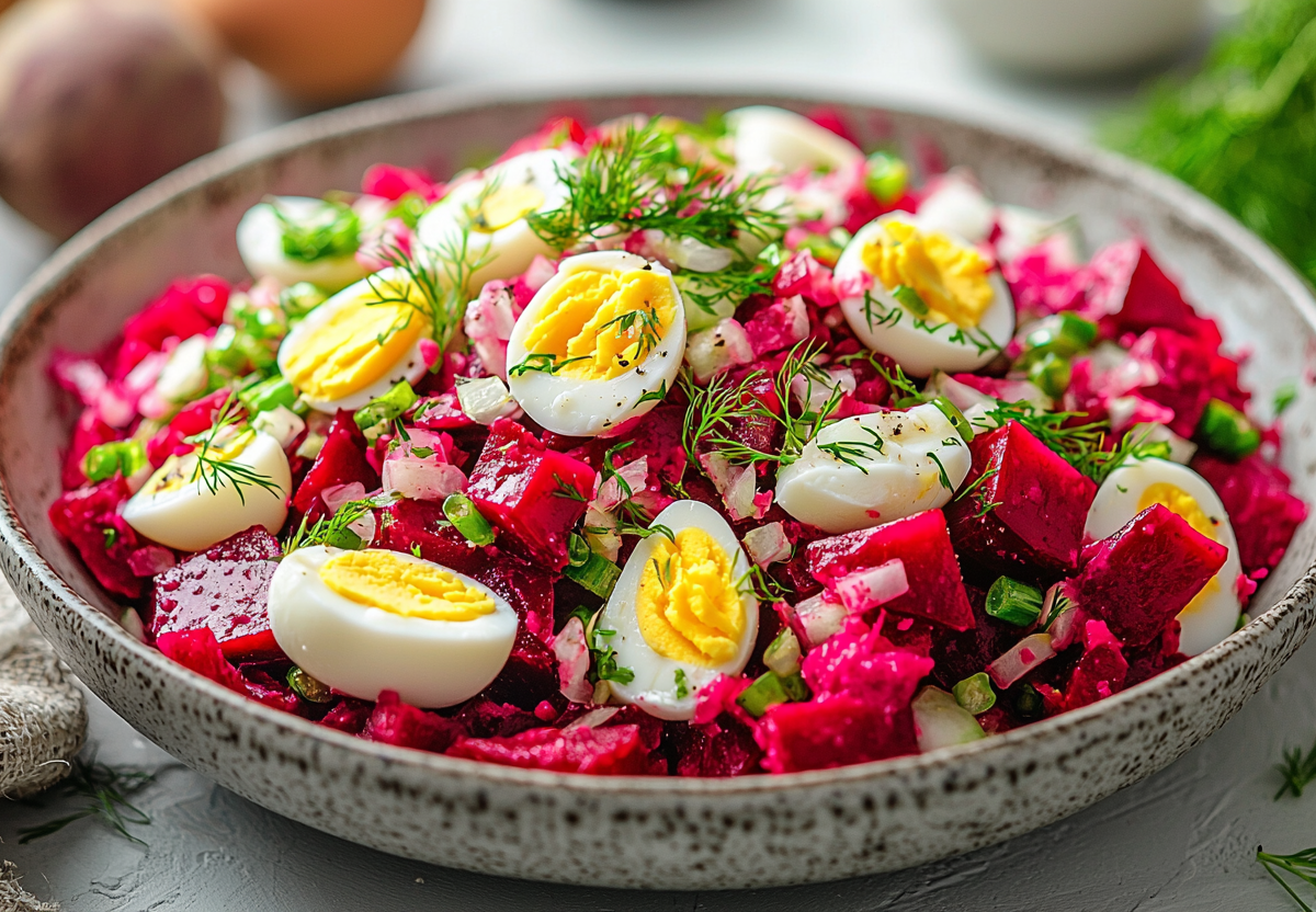 Из-за этого вкусного салата вся семья полюбила свеклу: смешиваем всего 3 простых ингредиента — они точно есть дома у каждого. Салат со свеклой и яйцом: яркий, сытный и готовится за 10 минут. Это находка для быстрого ужина или дополнения к любому основному блюду. Сочетание сладкой свеклы, хрустящих огурцов и нежного яйца создает идеальный баланс вкуса и текстуры.