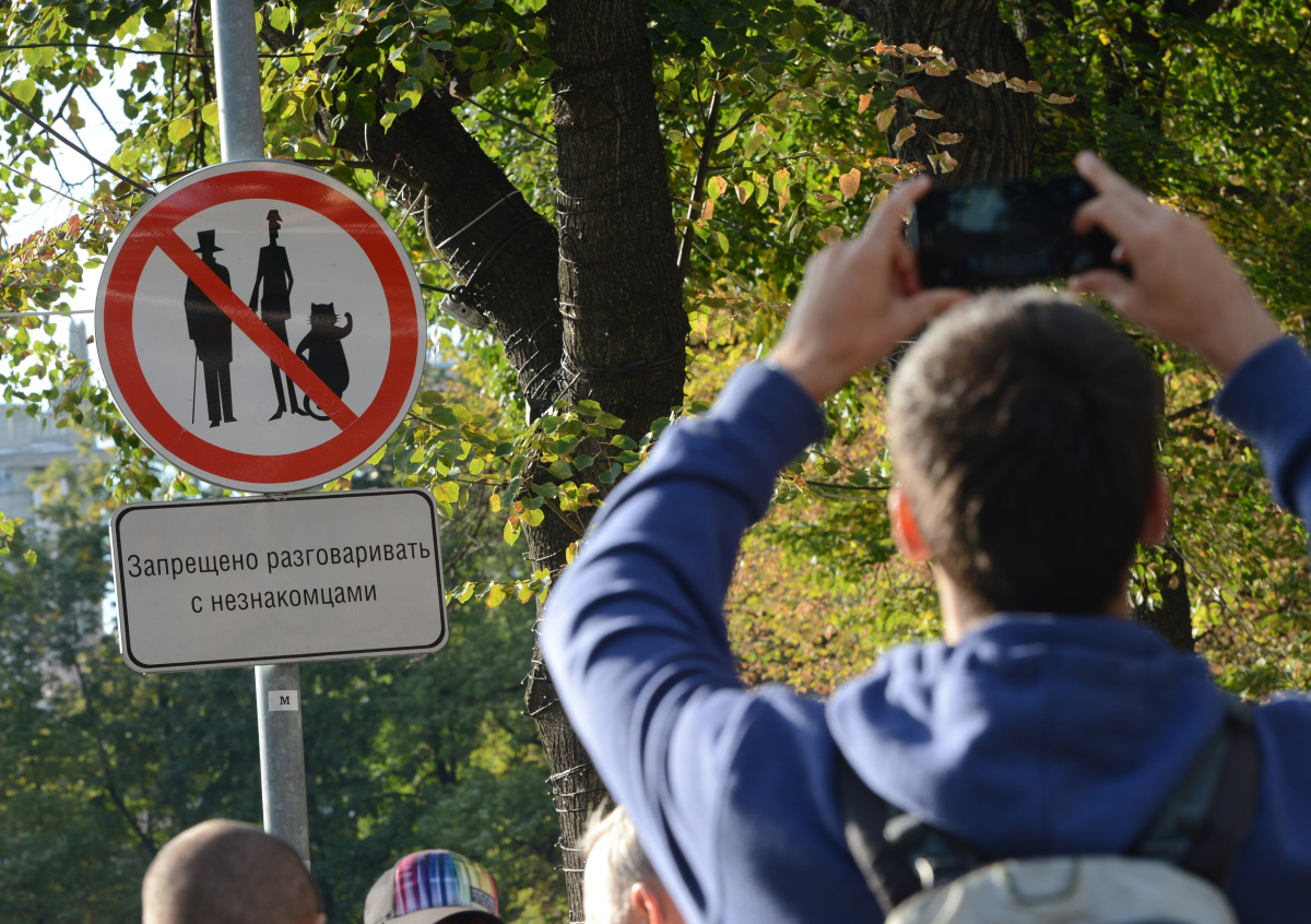 Знак «Запрещено разговаривать с незнакомцами» по мотивам романа Михаила Булгакова «Мастер и Маргарита», на котором изображены силуэты Воланда, Коровьева и кота Бегемота, появился на Патриарших прудах в 2012 году и стал своеобразной визитной карточкой этого культового места центра российской столицы.