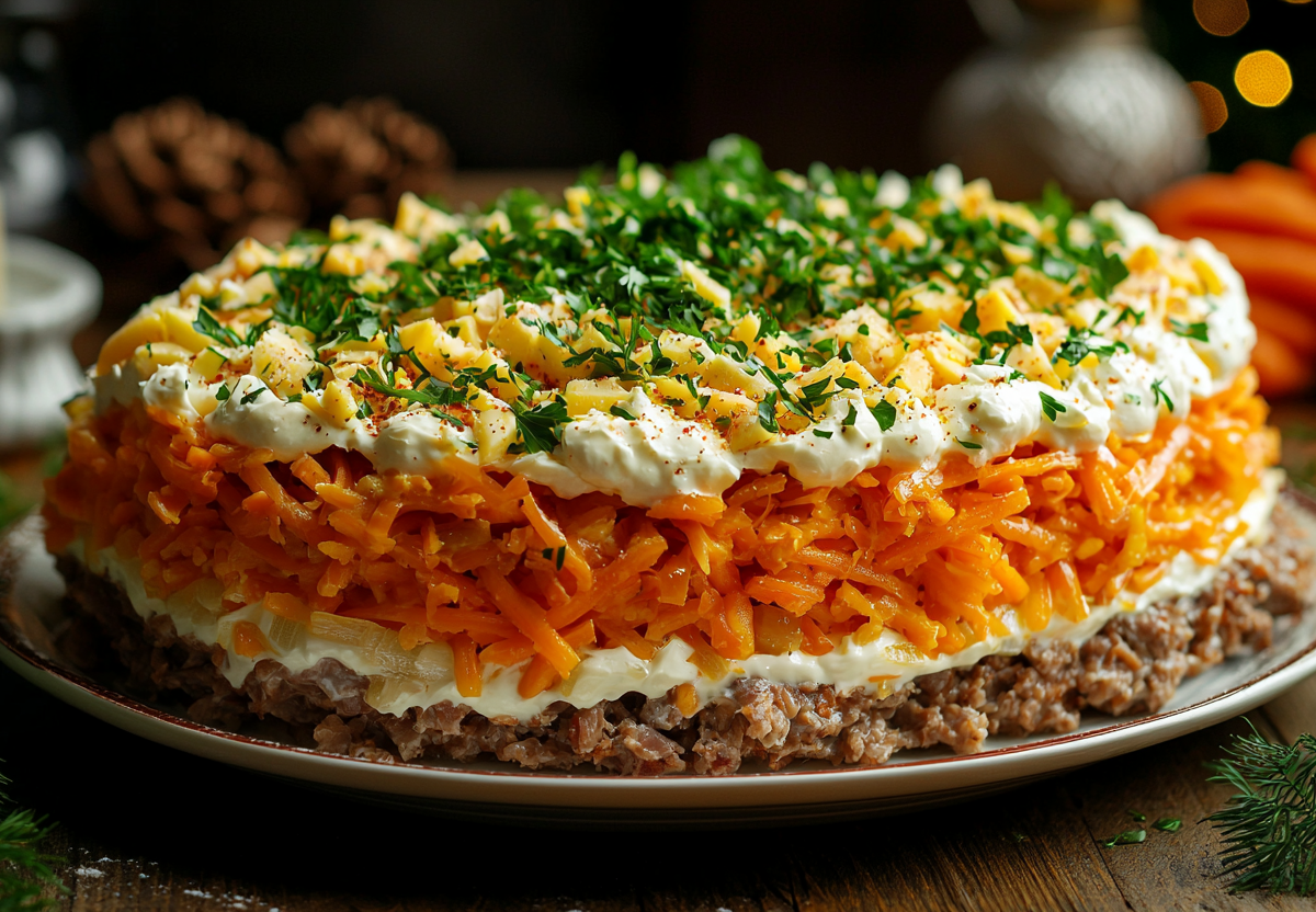 Вам понадобится: 300 г куриной печени (отварить в подсоленной воде 15–20 минут, остудить и мелко нарезать), 1 крупная луковица (нарезать полукольцами и замариновать на 15 минут в смеси 1 ст. л. уксуса, 1 ч. л. сахара и щепотки соли), 200 г готовой моркови по-корейски, 3 вареных яйца (натереть на средней терке), майонез для смазки слоев. Выкладывайте салат на плоское блюдо слоями, слегка промазывая каждый майонезом: 1 — измельченная печень, 2 — маринованный лук, 3 — морковь по-корейски, 4 — тертые яйца. Верхний яичный слой можно украсить веточкой зелени. Дайте салату настояться в холодильнике 1–2 часа.
