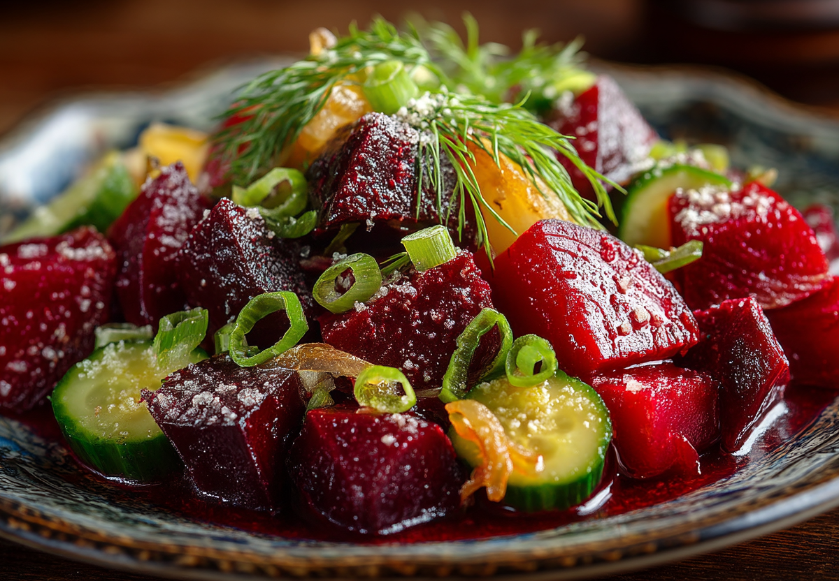 Беру свеклу, жареный лук и маринованные огурцы — и за 5 минут строгаю салат, который получается сочнее винегрета и готовится без лишних хлопот. Это гениально простое и невероятно вкусное блюдо, идеальное для быстрого ужина или как дополнение к мясу и гарнирам.