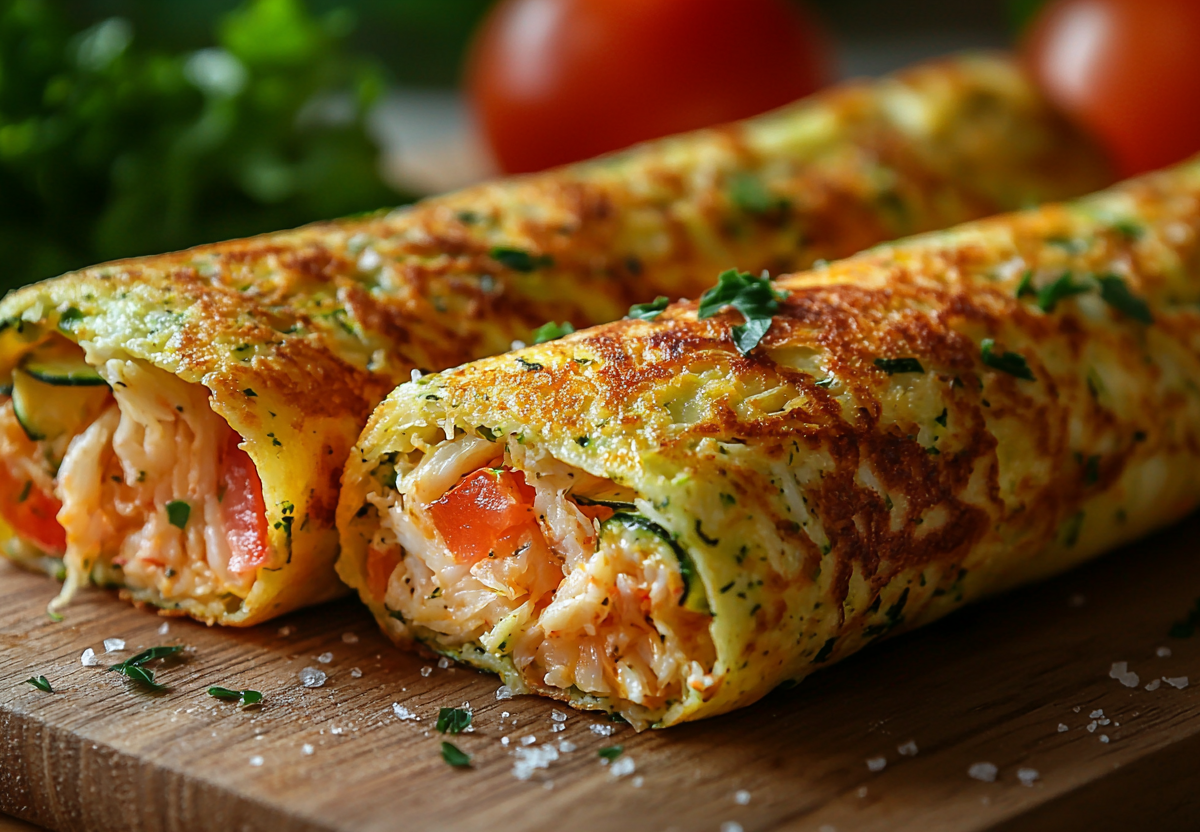 Приготовим нежные кабачковые рулетики. Для основы натрите кабачок (300 г), отожмите сок, добавьте 2 яйца, 2 ст. л. молока, соль, специи и 2 ст. л. рисовой муки. Перемешайте до однородности и обжарьте тонкие блинчики на сковороде с минимальным количеством масла. Для начинки возьмите помидор, 50 г сыра, 2-3 листа салата, зубчик чеснока и 1 ст. л. натурального йогурта. Сыр натрите, помидор нарежьте ломтиками, чеснок смешайте с йогуртом. На каждый блинчик положите лист салата, смажьте чесночно‑йогуртовой смесью, добавьте сыр, помидоры и немного крабовых палочек. Аккуратно сверните рулетиком, разрежьте пополам — и можно подавать. Получается вкусно, свежо и совсем не калорийно!