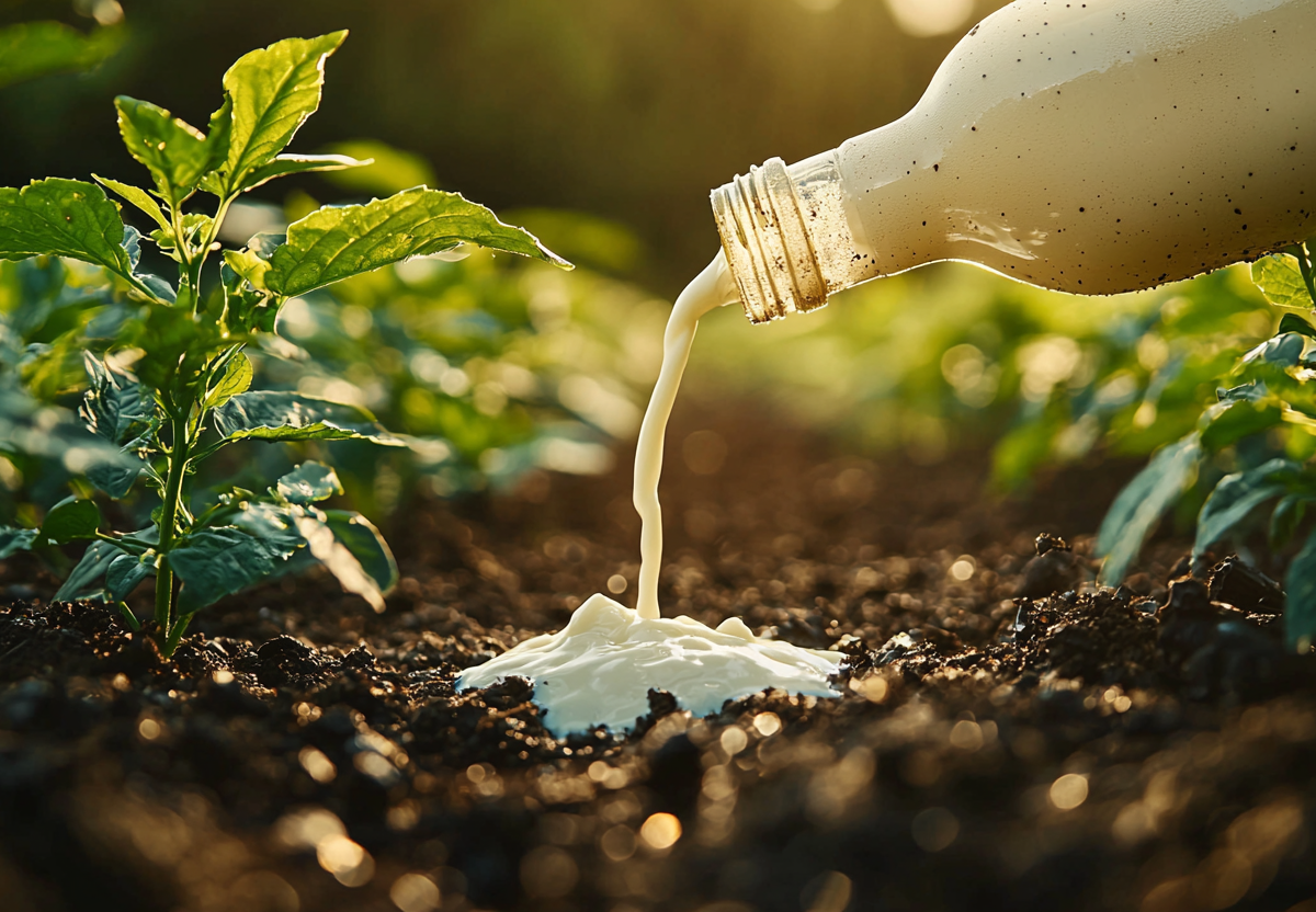 Разведенное молоко водой (1:4) становится мощным удобрением: кальций укрепляет клеточные стенки растений, предотвращая вершинную гниль у томатов и растрескивание корнеплодов. Лактоза и молочные кислоты создают на листьях защитную пленку, блокируя споры мучнистой росы и фитофторы. А еще молоко — природный репеллент: его запах отпугивает тлю, крестоцветных блошек и слизней, которые ненавидят молочные жиры.