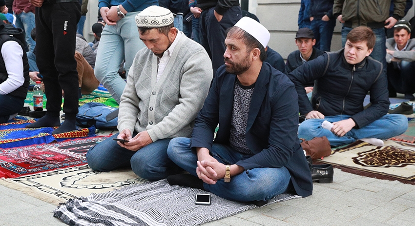 По традиции Соборная мечеть всех желающих вместить не смогла. Внутри помещения верующие занимали место с ночи, и уже к шести утра прихожан впускать перестали. Для молитвы они размещались возле здания. К началу богослужения на площадке перед мечетью раскинулось настоящее людское море.