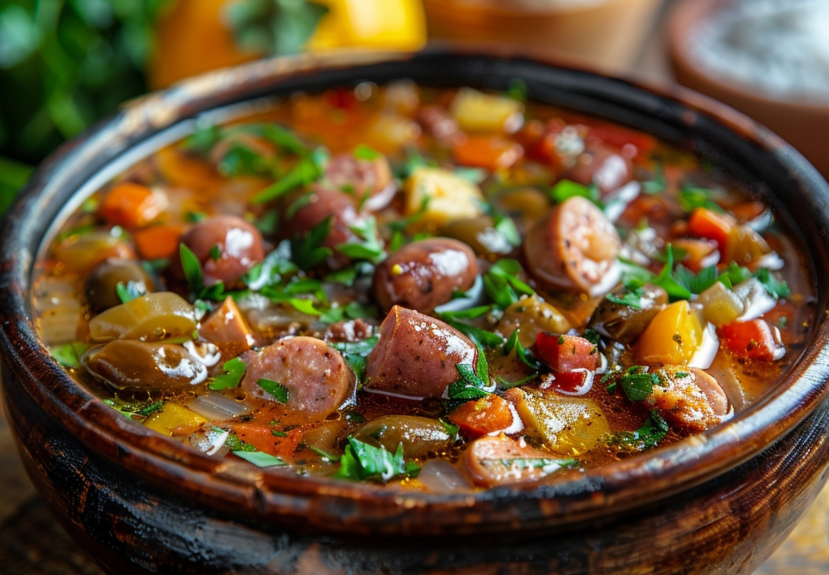 Солянка — русский национальный суп с характерным кисло-соленым вкусом. Рассказываем, как сварить солянку с колбасой, картофелем, огурцами и лимоном.