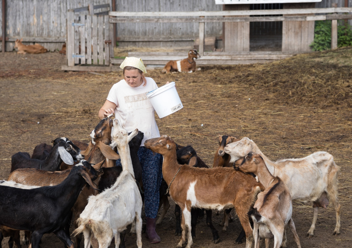 До того, как у Елены появилась ферма, она была бухгалтером. Когда появилась дочка, они с мужем решили завести козу. Сейчас на их ферме живут 28 коз, 22 коровы, 6 телят, барашки, кролики, хрюшки, куры и лошадь.