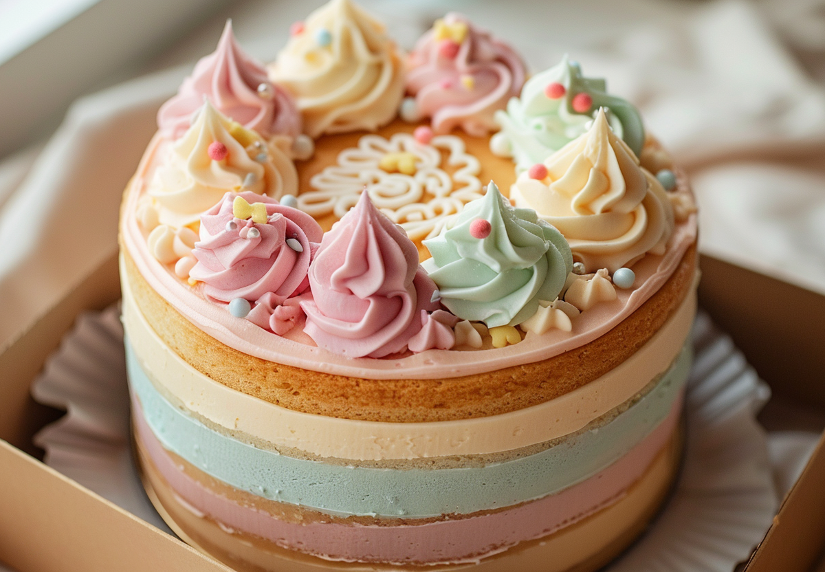 Соберите торт: чередуйте коржи и крем, слегка прижимая. Верх и бока аккуратно обмажьте с помощью силиконовой лопатки. Украсьте по вкусу — узорами из крема, надписями, фигурками, цветами или посыпкой. Поместите в крафтовую коробку — как в настоящей кондитерской.