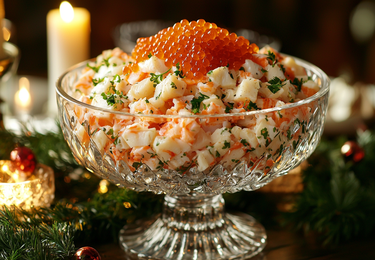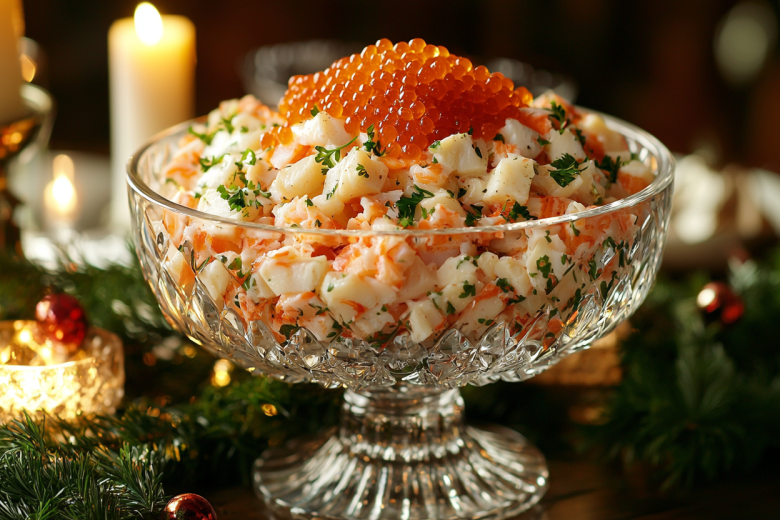 Вкус этого салата — это настоящая симфония моря: нежные крабовые палочки гармонично сочетаются с пикантными кальмарами, сладковатыми мидиями и креветками, а сыр придает блюду приятную сливочную ноту. Этот салат поразит ваших гостей изысканностью и простотой приготовления!