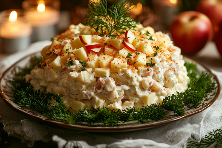 Салат получается удивительно свежим и сбалансированным: нежная, чуть сладковатая соломка кальмара, сочная кислинка яблока и сливочные яйца создают легкую, но очень насыщенную композицию. Это идеальный вариант для начала праздничного застолья.