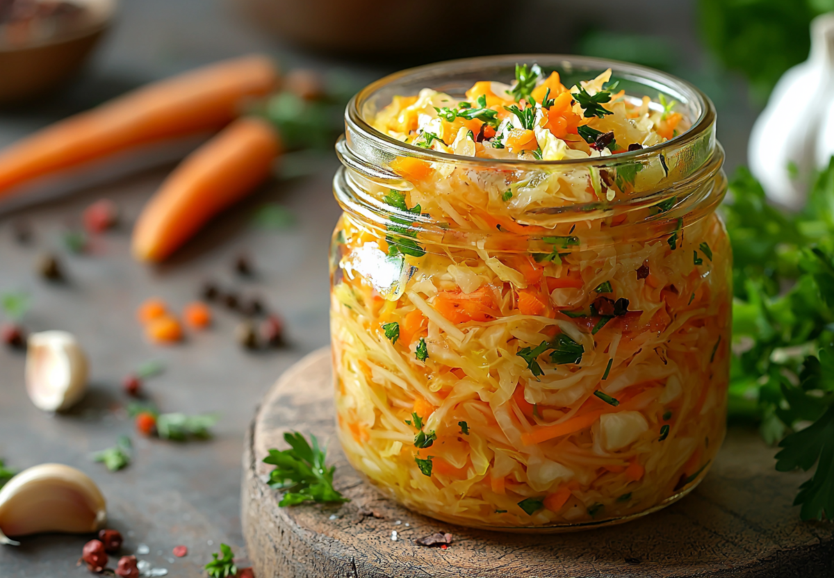 Готовлю я так: шинкую 2 кг свежей капусты, натираю 3–4 морковки на крупной терке, добавляю 4 измельченных зубчика чеснока. Для маринада кипячу литр воды с половиной стакана сахара, 2 столовыми ложками соли с горкой, 10 горошинами перца, 5 гвоздиками и 4 лавровыми листами — провариваю 10 минут. Снимаю с огня, добавляю по половине стакана растительного масла и 9% уксуса. Заливаю капусту немного остывшим маринадом, придавливаю гнетом и оставляю до полного остывания. Затем перекладываю в банку и убираю в холодильник на сутки. Уже через 24 часа получается ароматная, хрустящая закуска, которая хранится в холодильнике несколько недель.