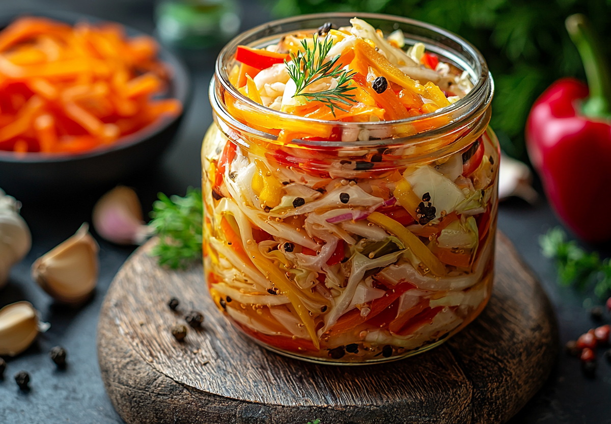 - Овощи заливают кипящим маринадом, ещё раз аккуратно перемешивают, накрывают тарелкой и ставят под гнёт на 3–4 часа при комнатной температуре. Готовую капусту раскладывают по стерильным банкам, заливают оставшимся маринадом и убирают в холодильник. Пробовать можно уже через сутки, но настоящий вкус раскрывается на 2–3 день.