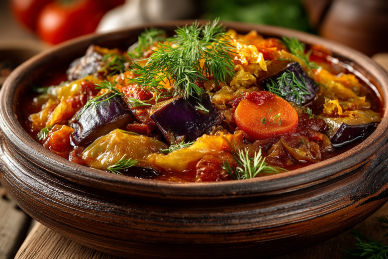 Капуста белокочанная — 500 г, баклажаны — 2 шт. (средних), помидоры — 2-3 шт., морковь — 1 шт., лук репчатый — 1 шт., чеснок — 2 зубчика, масло растительное — 3–4 ст. л., соль — по вкусу, перец черный молотый — по вкусу, зелень свежая (петрушка, укроп) — для подачи, вода или овощной бульон — 50–100 мл (при необходимости).