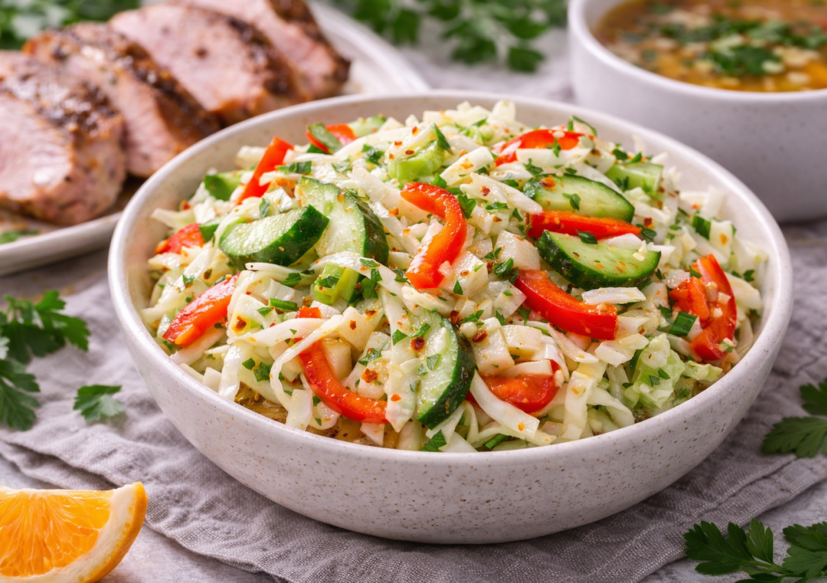 Ингредиенты: белокочанная капуста — 500 г, болгарский перец — 1–2 шт., свежие огурцы — 2–3 шт. (средние), репчатый лук — 1 шт. Заправка: мед — 1,5 ст. л., соль — 1 ч. л. (или по вкусу), уксус 9% — 3–4 ст. л., растительное или оливковое масло — 3–4 ст. л.