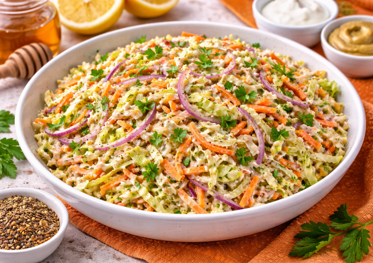 Хрустящий, сочный и удивительно гармоничный — этот салат исчезает со стола первым. Секрет не в капусте, а в нежной йогуртовой заправке с легкой сладостью меда и пикантной горчинкой. Попробуете один раз — и по-другому уже не захотите.