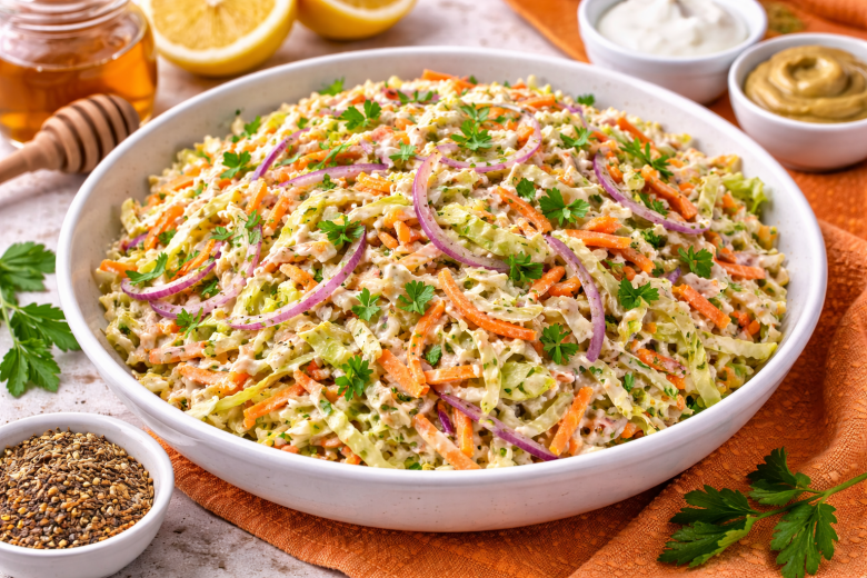 Хрустящий, сочный и удивительно гармоничный — этот салат исчезает со стола первым. Секрет не в капусте, а в нежной йогуртовой заправке с лёгкой сладостью мёда и пикантной горчинкой. Попробуете один раз — и по-другому уже не захотите.