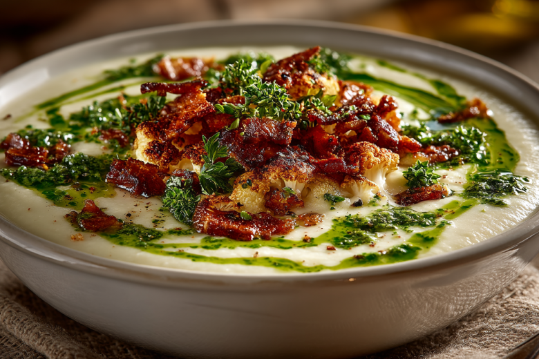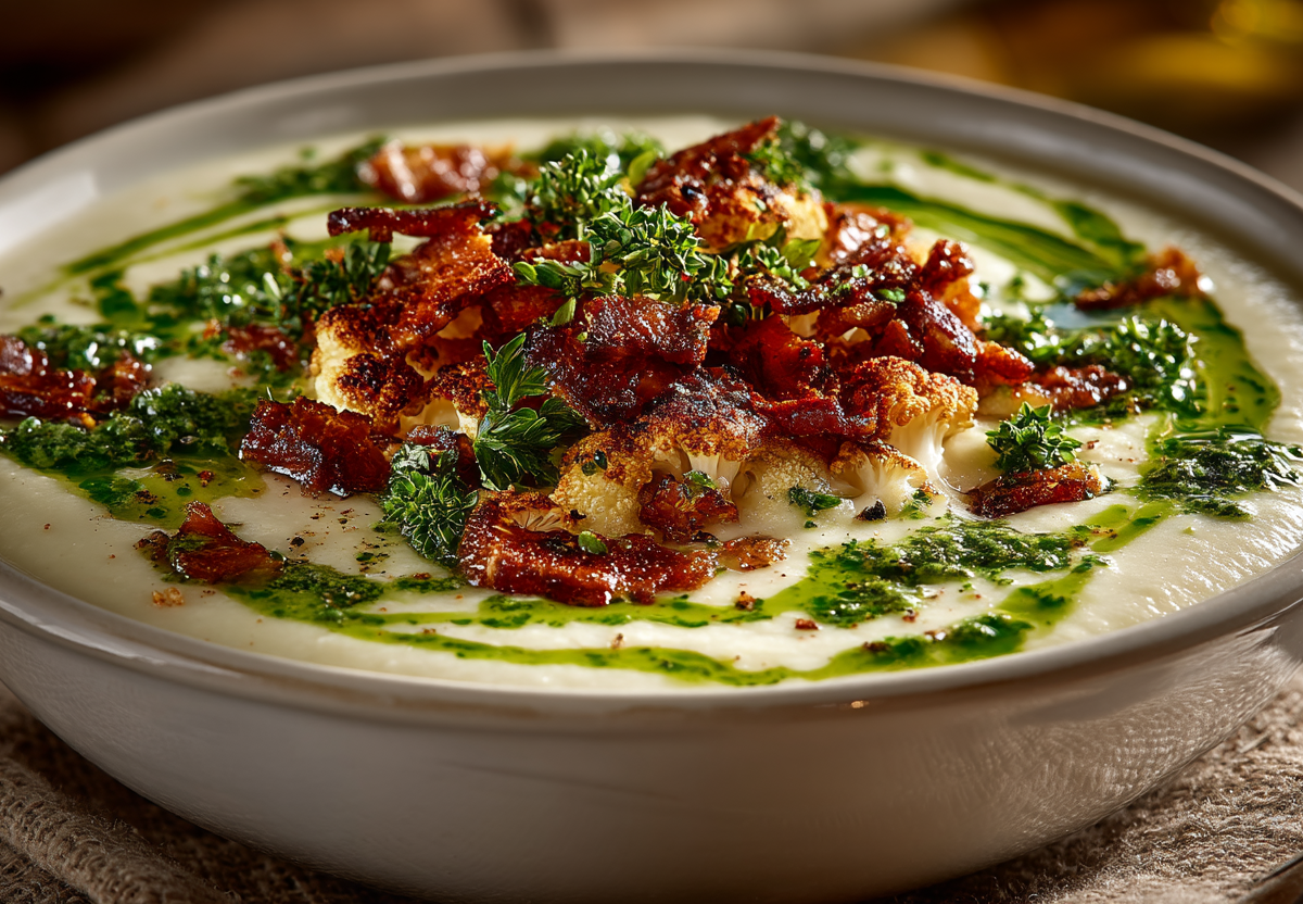Идеальное блюдо строится на балансе текстур и температур. Здесь нежный, шелковистый крем-суп встречается с хрустящими кусочками бекона, а теплая основа — с прохладной каплей ароматного зеленого масла.