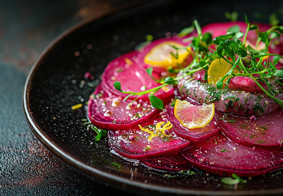 Карпаччо из запеченной свеклы с селедочным форшмаком — необычная и яркая закуска: готовлю к празднику и для уютных посиделок