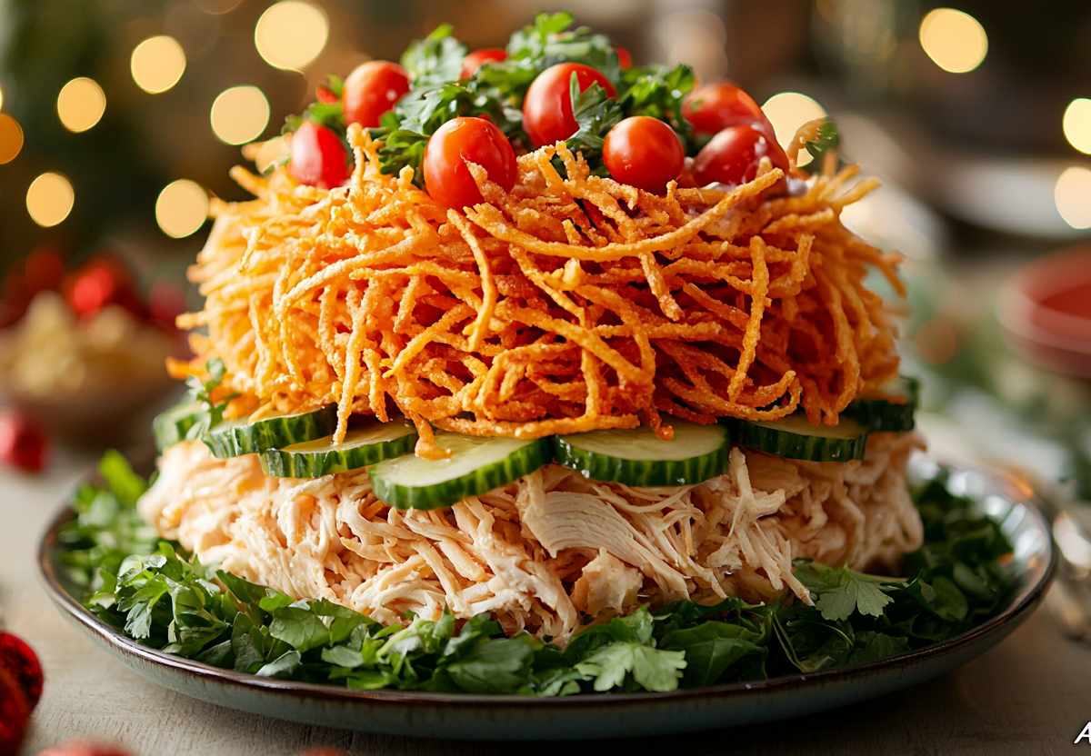 Картофельная соломка делает этот салат невероятным: готовим «Муравейник» — простой рецепт на Новый год и любой праздник. Сохраните этот рецепт, чтобы он всегда был под рукой в предпраздничной суете! Этот салат — настоящий праздник текстур. Он сочетает в себе нежную курицу, свежие овощи, сыр и, главное, хрустящую картофельную соломку, которая и создает его знаменитый «муравейник». Необычная подача гарантирует восторг ваших гостей.
