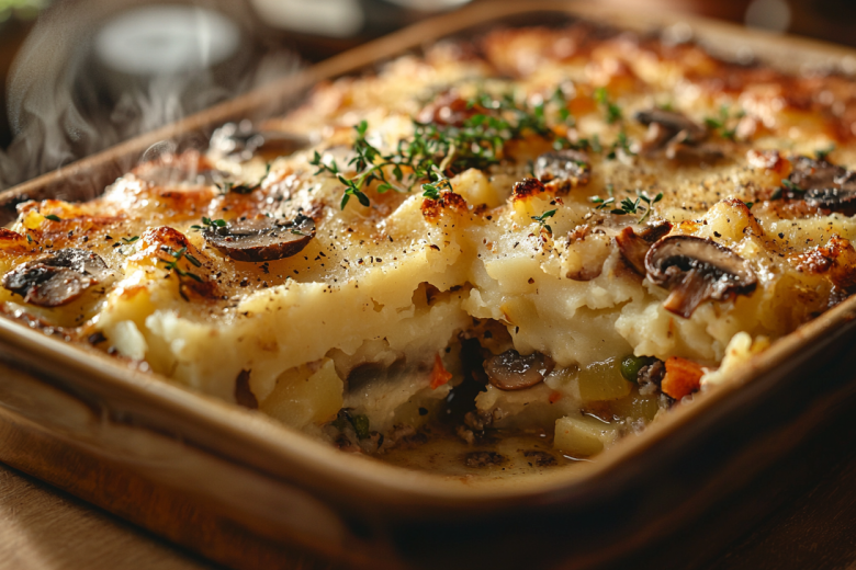 - Выложите половину картофельного пюре, распределите овощную начинку и накройте оставшимся пюре. Вилкой создайте узор на поверхности, украсьте грибами и запекайте 20 минут при 180°C до золотистой корочки.