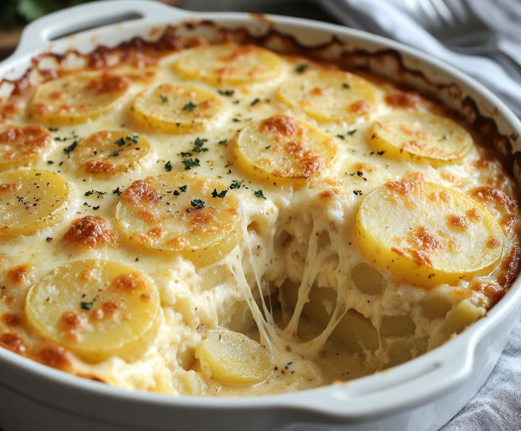 Для приготовления вам понадобится: 6–8 средних картофелин, 150 мл сливок — 20%, 100 г моцареллы, 70 г пармезана, 70 г чеддера, 2 зубчика чеснока, соль, перец и мускатный орех по вкусу. Картофель очистите и нарежьте тонкими кружочками (лучше всего — овощерезкой). Смешайте сливки с измельченным чесноком, солью, перцем и щепоткой мускатного ореха. Форму смажьте маслом, выложите слой картофеля, слегка посыпьте пармезаном и чеддером, повторите слои, заливая каждый небольшим количеством сливок. Верхний слой картофеля залейте оставшимися сливками и щедро посыпьте смесью всех трех сыров. Накройте фольгой и запекайте при 190 градусах 30 минут, затем снимите фольгу и готовьте еще 10–15 минут до золотистой сырной корочки. Дайте запеканке отдохнуть 10 минут перед подачей — так слои станут плотнее, и блюдо будет идеально держать форму.