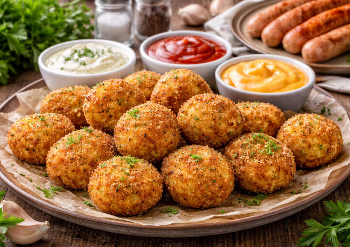 Картофель очищают, нарезают кусочками и отваривают в подсоленной воде до мягкости. Затем воду сливают и разминают в однородное пюре. В горячую массу добавляют тертый сыр, измельченный чеснок, соль, перец и крахмал, все тщательно перемешивают. Из картофельной массы формируют небольшие шарики, обваливают их в панировочных сухарях, чтобы получилась аппетитная корочка. В сковороде разогревают масло и обжаривают кругетсы с двух сторон до румяности и хруста. Получается невероятно ароматно, сытно и по-домашнему уютно — такая картошка нравится и детям, и взрослым.