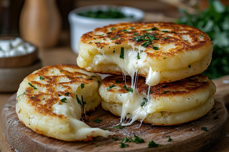 Вам понадобится: 5–6 крупных картофелин, 1 небольшая луковица, 1 яйцо, 2 ст. л. муки, 150 г твердого сыра (например, моцарелла или чеддер), соль, черный перец по вкусу, растительное масло для жарки. Картофель и лук очистите и натрите на мелкой терке. Полученную массу тщательно отожмите через марлю или сито, чтобы удалить лишний крахмальный сок, — это сделает оладьи более хрустящими. В миску с отжатой картофельно-луковой массой добавьте яйцо, муку, соль и перец. Тщательно перемешайте до однородности. Сыр нарежьте небольшими кубиками размером примерно 1х1 см. На хорошо разогретую сковороду с маслом выкладывайте столовой ложкой порцию картофельного теста, слегка приплюсните. В центр каждой лепешки положите 1–2 кубика сыра. Сверху накройте еще одной ложкой теста, аккуратно прижмите края, чтобы начинка оказалась полностью внутри. Обжаривайте оладьи на среднем огне по 3–4 минуты с каждой стороны до образования красивой золотисто-коричневой корочки. Готовые оладьи выложите на бумажное полотенце, чтобы удалить излишки масла. Подавайте горячими со сметаной или соусом на основе йогурта.