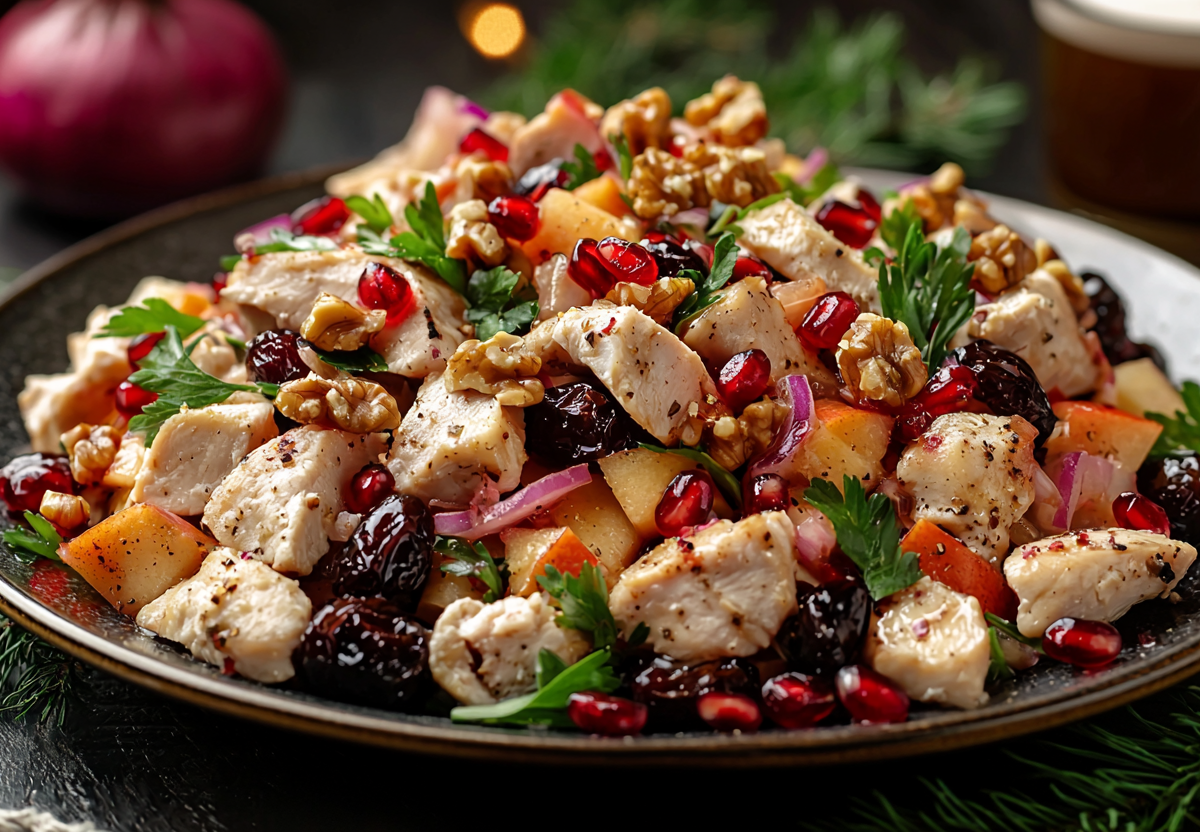Этот салат сочетает в себе лучшие черты немецкой кухни — сытность, пряность и легкую пикантность — с более утонченными и праздничными ингредиентами. Копченая курица придает блюду глубокий аромат, а чернослив добавляет приятную сладковатую ноту, идеально гармонируя с горчичной заправкой. Такой салат не только вкуснее классического варианта с колбасой, но и выглядит более изысканно, оставаясь при этом простым в приготовлении.