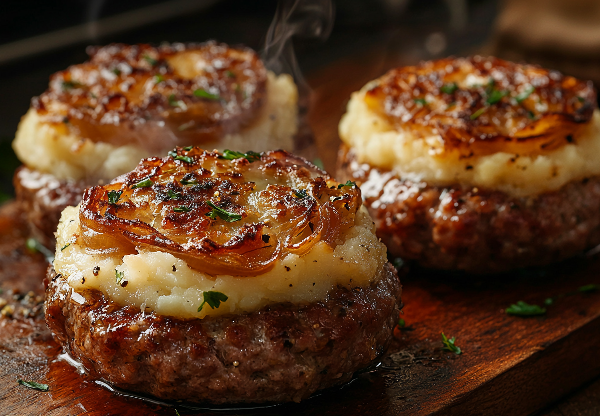 - Фарш смешайте с сухим чесноком, солью и перцем. Сформируйте плоские котлеты и выложите их на противень. Лук нарежьте и обжарьте до золотистого цвета, смешайте его со сметаной/майонезом, чесноком и сыром. Картофель растолчите в неоднородное пюре с водой из под варки.