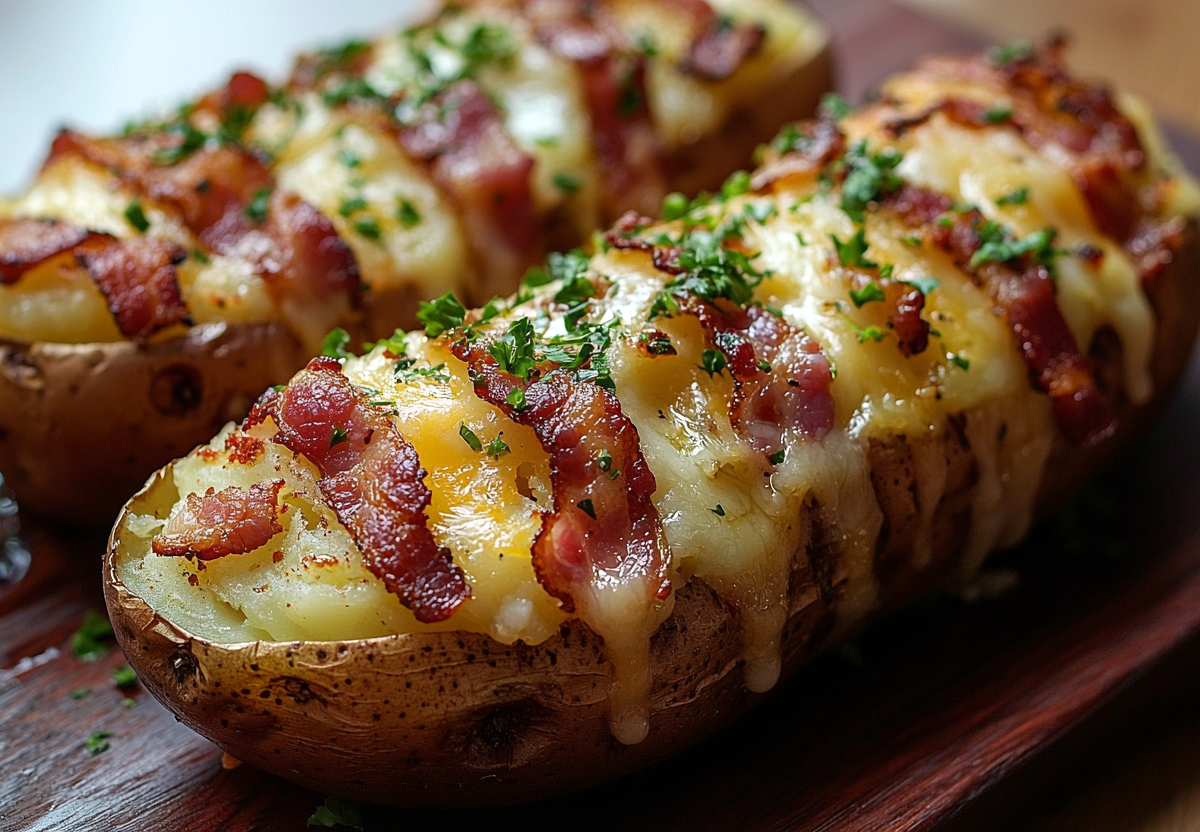 Поместите картофель на противень, застеленный пергаментом, и отправьте в разогретую до 200 °C духовку. Запекайте 40–50 минут, пока картофель не станет мягким, а бекон — румяным и хрустящим.