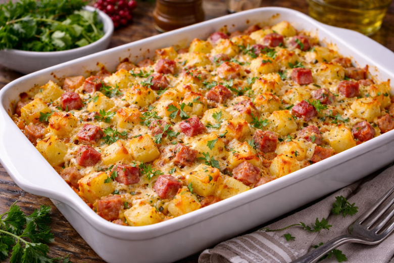 Вкусная запеканка из картошки и карбонада — идеальный вариант, когда хочется сытного домашнего ужина без долгой готовки. Ничего обжаривать не нужно: просто нарезаем продукты мелкими кубиками, смешиваем и запекаем. В итоге получается ароматное, сочное блюдо с румяной сырной корочкой, которое отлично подойдёт для праздника.