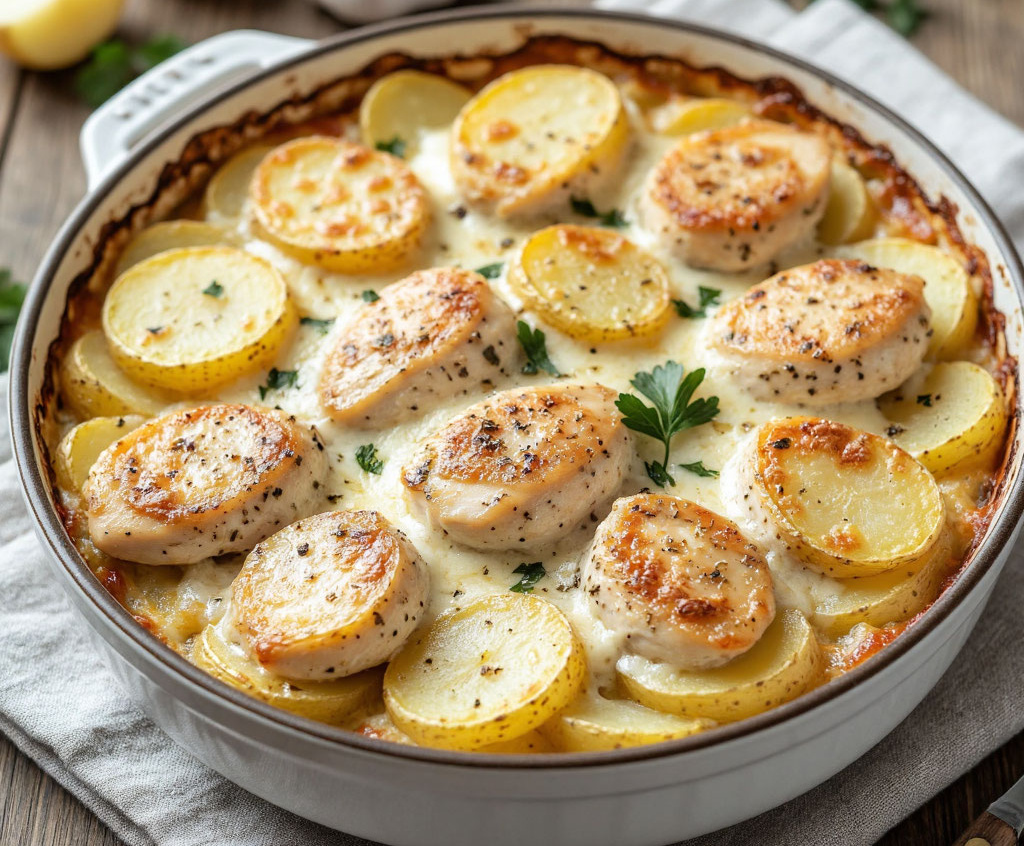 Для приготовления вам понадобится: 500 г куриного филе, 4–5 крупных картофелин, 200 г сулугуни, 300 мл сливок 20%, 3 зубчика чеснока, соль, черный перец и щепотка хмели-сунели. Картофель очистите и нарежьте тонкими кружочками, куриное филе — небольшими пластинами. Форму для запекания смажьте маслом, выложите слой картофеля, затем слой курицы, посолите, поперчите, посыпьте частью тертого сулугуни и измельченным чесноком. Повторите слои. Верхний слой — картофель. Смешайте сливки с солью и специями, залейте запеканку, чтобы почти покрыть верхний слой. Щедро посыпьте оставшимся сулугуни. Запекайте под фольгой 40 минут при 190 градусах, затем снимите фольгу и готовьте еще 10–15 минут до румяной сырной корочки. Дайте постоять 10 минут — и можно звать гостей к столу.