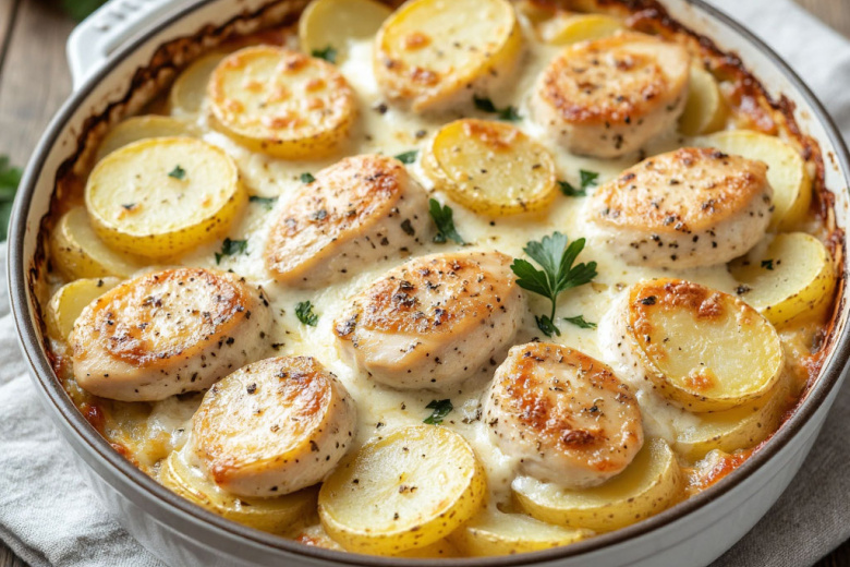 Для приготовления вам понадобится: 500 г куриного филе, 4–5 крупных картофелин, 200 г сулугуни, 300 мл сливок 20%, 3 зубчика чеснока, соль, чёрный перец и щепотка хмели-сунели. Картофель очистите и нарежьте тонкими кружочками, куриное филе — небольшими пластинами. Форму для запекания смажьте маслом, выложите слой картофеля, затем слой курицы, посолите, поперчите, посыпьте частью тёртого сулугуни и измельчённым чесноком. Повторите слои. Верхний слой — картофель. Смешайте сливки с солью и специями, залейте запеканку, чтобы почти покрыть верхний слой. Щедро посыпьте оставшимся сулугуни. Запекайте под фольгой 40 минут при 190 градусах, затем снимите фольгу и готовьте ещё 10–15 минут до румяной сырной корочки. Дайте постоять 10 минут — и можно звать гостей к столу.