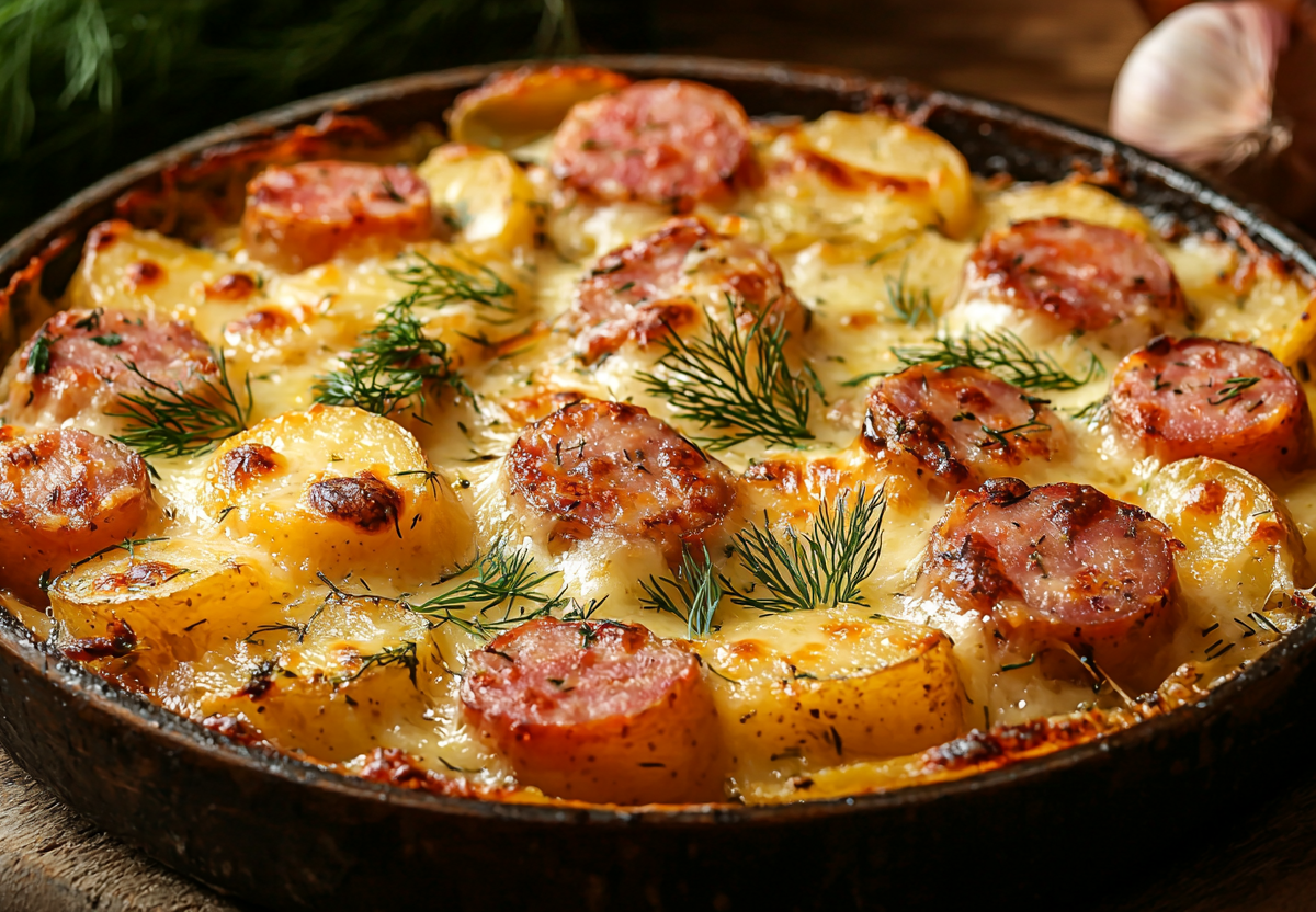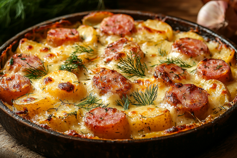 Картошка с колбасками по-охотничьи: сырно-чесночная корочка покорит всех