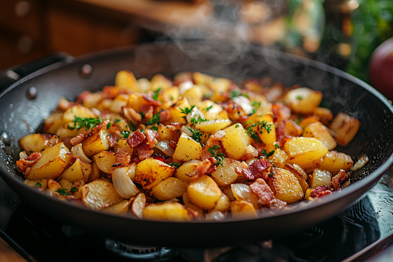 Вам понадобится: 6–8 картофелин, 300 г сала или бекона, 2 крупные луковицы, соль, перец. Сало или бекон нарежьте мелкими кубиками и обжарьте на сковороде до образования хрустящих шкварок, затем выньте их шумовкой. В оставшемся жире обжарьте нарезанный кубиками картофель до золотистой корочки, посолите и поперчите. За 5 минут до готовности добавьте к картошке тонко нарезанный лук и шкварки, тщательно перемешайте и доведите до готовности под крышкой.