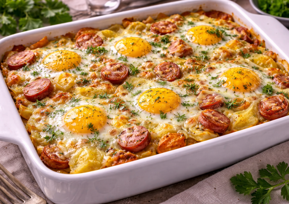 Как готовлю: картофель очищаю, нарезаю тонкими кружочками и отвариваю в кипящей подсоленной воде 5–7 минут до полуготовности. Сосиски режу колечками, сыр натираю на крупной терке. Для соуса растапливаю сливочное масло, добавляю муку и быстро размешиваю. Вливаю молоко, постоянно помешивая, пока соус не станет гладким и слегка густым. Добавляю соль, перец и мелко нарезанную зелень. В форму для запекания выкладываю картофель, затем сосиски, заливаю соусом. Сверху аккуратно разбиваю яйца и посыпаю тертым сыром. Запекаю при 180 °C около 25–30 минут, пока сверху не появится золотистая корочка.
